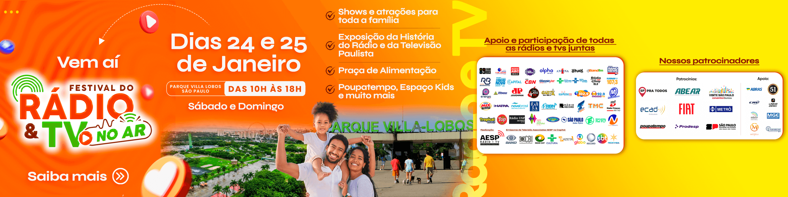 São Paulo será palco de uma grande celebração da comunicação nos dias 24 e 25 de janeiro de 2026, sábado e domingo, com a realização do Festival de Rádio e Televisão Paulista, promovido pela AESP – Associação das Emissoras de Rádio e Televisão do Estado de São Paulo. O evento acontece no Parque Villa-Lobos, das 10h às 18h, reunindo todas as emissoras de rádio e televisão da capital paulista em uma programação aberta ao público.